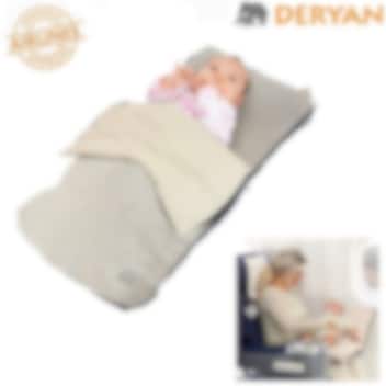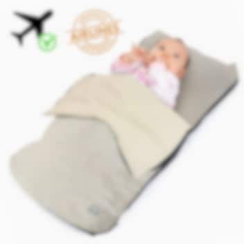 Denne smarte og innovative oppustelige madras giver din baby en behagelig plads at sidde eller sove på under flyrejsen. Deryan Airtraveller Cream gør det muligt for dig at have hænderne fri, så du for eksempel kan spise, læse eller slappe af, mens dit barn ligger trygt og komfortabelt. Madrassen er ideel til flyrejser, men kan også bruges på længere ture med tog eller bus. Barnet kan sidde på dit skød og vende i den retning, der føles mest behagelig. Det bløde design og det aftagelige tæppe skaber en hyggelig og støttende liggeplads, som gør rejsen mere afslappet for både barn og forælder.