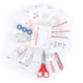 Indhold: saks, pincet, sikkerhedsnåle, gasbind, bandager, antiseptiske vådservietter, termometer, sårbånd, plastre, brændstofgel, øjenvask og antiseptisk creme.