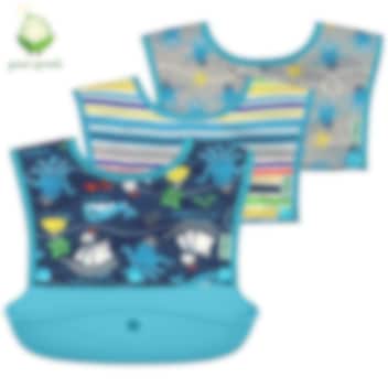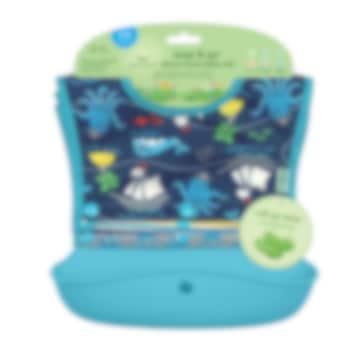 Green Sprouts Snap & Go Pirates 3-i-1 er et smart og praktisk sæt med tre udskiftelige hagesmække og en opsamlingslomme i silikone. Efter fodring rulles hagesmækken nemt sammen og sikres, så indholdet ikke vælter ud. Det betyder, at du kan vente med at vaske hagesmækken, indtil du er hjemme. Hagesmækkene har en rummelig opsamlingslomme i fødevaregodkendt silikone, og toppen, som er aftagelig, er lavet af vandtæt polyester. Toppen kan maskinvaskes, mens opsamlingslommen vaskes separat. Snap & Go-modellen har buede sider, der følger barnets bevægelser, hvilket gør hagesmækkene komfortable og nemme at bruge. Kort sagt: en smart og praktisk hagesmæk, der er lige så god på tur som hjemme. Tag hagesmækkene med i håndbagagen, pusletasken eller pungen.