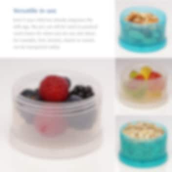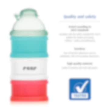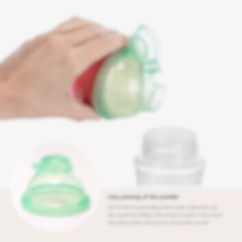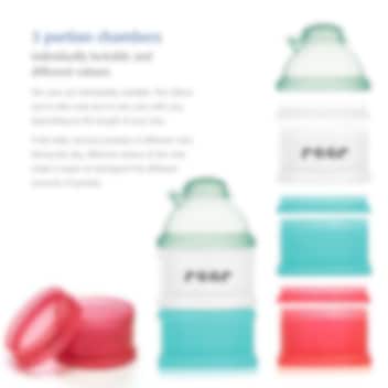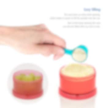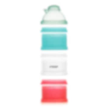 Smart, transportabel beholder med flere etager til mælkepulver eller modermælkserstatning. Portionsbægerne rummer ca. 60 gram pulver hver og kan skrues sammen efter behov en, to eller tre ad gangen, afhængigt af hvor mange måltider du skal give uden for hjemmet. Takket for det tragtformede låg er det særligt bekvemt at hælde pulveret i flasken uden at spilde. En fremragende praktisk hjælper når du færdes ude med din baby.