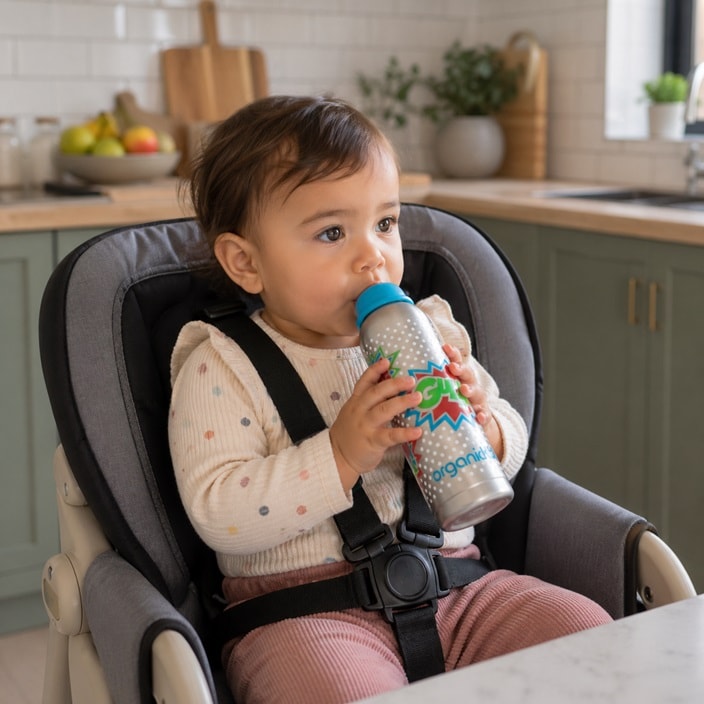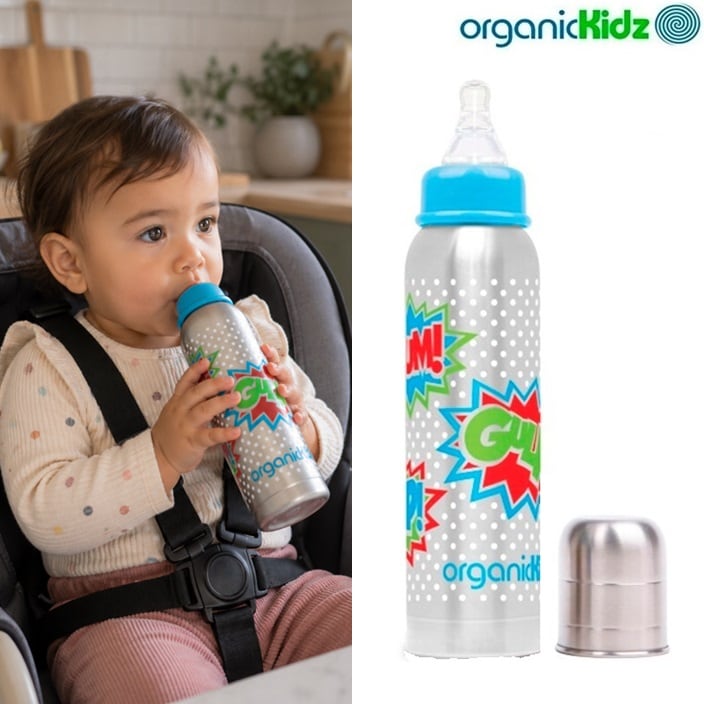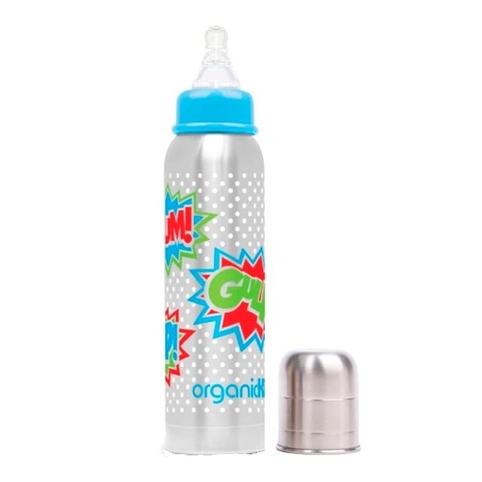 OrganicKidz Bam! er en holdbar termoflaske til børn og sutteflaske til babyer, lavet af rustfrit stål med termofunktion – en drikkeflaske med termofunktion og termo i én. Flasken holder drikken varm eller kold i op til 6 timer, hvilket gør den perfekt til både hjemmebrug, på tur, i byen eller i naturen. Den bule- og brudsikre sutteflaske er sikker for børn og et godt alternativ til plast- og aluminiumsflasker. Når barnet vokser, kan flasken bruges som termoflaske med drikketud eller som almindelig termos til varme drikke eller vand. Flasken er fremstillet af rustfrit stål, fri for PVC, bisphenol A og ftalater. Den har en blød silikonesut og et låg, der også fungerer som målebæger, hvilket gør den både praktisk og holdbar. OrganicKidz Bam! er et alsidigt og sikkert valg til børn og babyer, som gør måltider og drikkeoplevelser nemmere og sjovere.