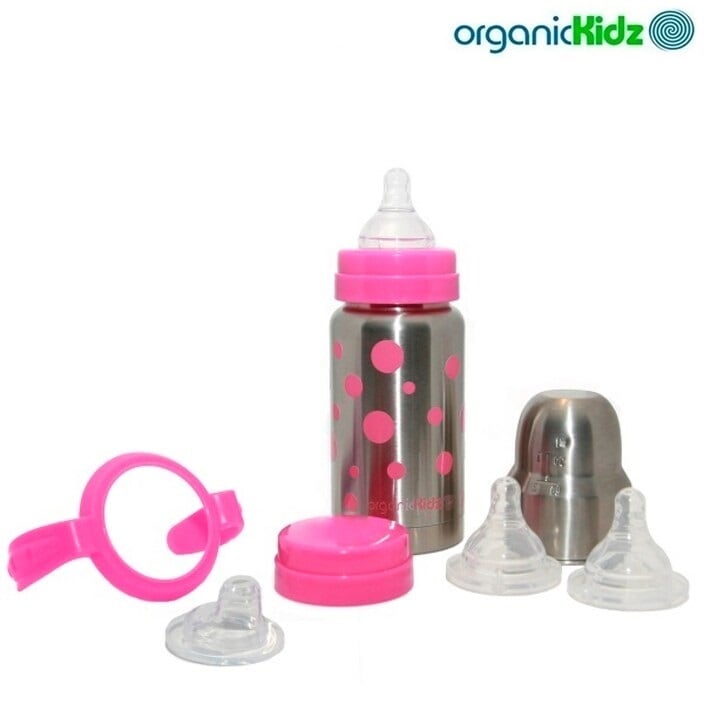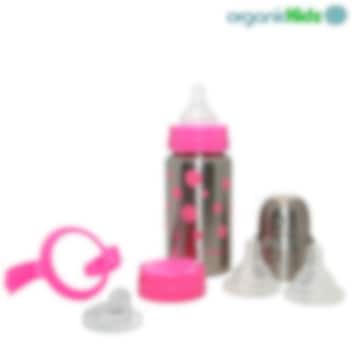 OrganicKidz Baby Grows Up Pink Dots er en multifunktionel sutteflaske i rustfrit stål på 200 ml, som kan bruges fra fødslen og helt op til skolealderen. Sættet indeholder tre bløde silikonesutter med forskellige drikkehastigheder, et aftageligt håndtag, en drikketud og to flaskehætter, hvilket gør det nemt at tilpasse flasken efter barnets alder og behov. Den dobbelte væg og termofunktion holder drikken varm eller kold i op til 6 timer, hvilket gør flasken perfekt til hjemmebrug, på ture, i byen eller i naturen. Den bule- og brudsikre flasken er et børne- og miljøvenligt alternativ til plast- eller aluminiumsflasker. Flasken kan gradvist omdannes fra sutteflaske til småbarns drikkeflaske og til sidst til skolebørns drikketermo, hvilket giver langvarig funktionalitet. Sættet leveres i en smuk gaveæske og er ideelt som dåbsgave. Flasken er fri for PVC, bisphenol A og ftalater og kan vaskes i opvaskemaskinen på øverste hylde.