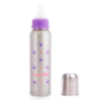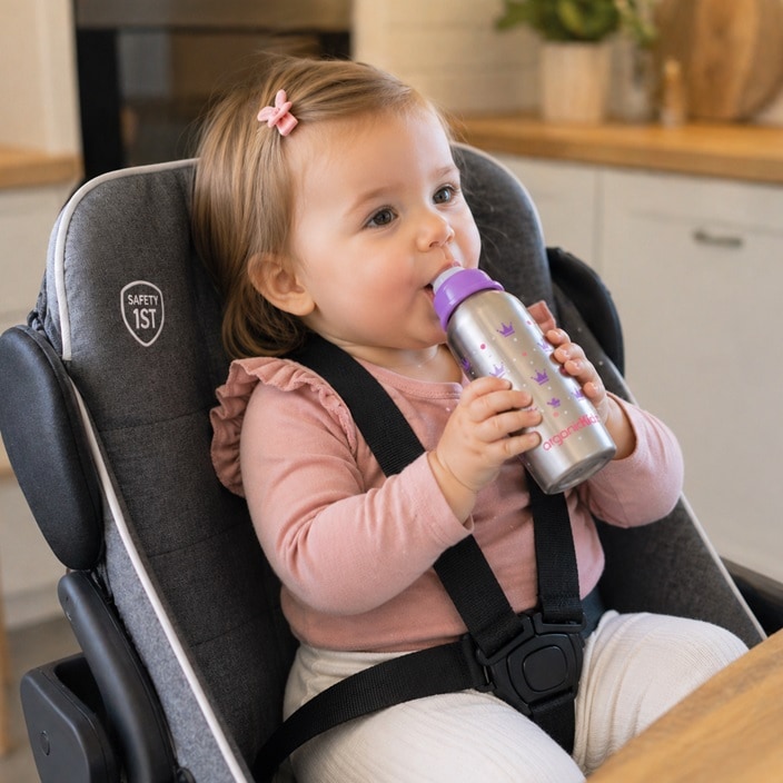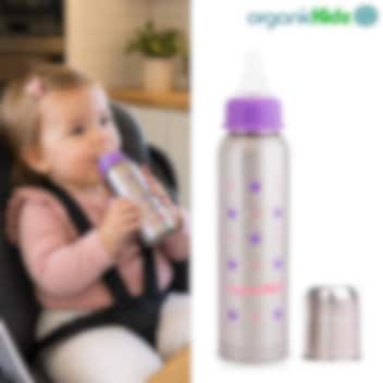 OrganicKidz Posh er en holdbar termoflaske til børn og sutteflaske til babyer, lavet af rustfrit stål med termofunktion – en drikkeflaske med termofunktion og termo i én. Flasken holder drikken varm eller kold i op til 6 timer, hvilket gør den perfekt til både hjemmebrug, på tur, i byen eller i naturen. Den bule- og brudsikre sutteflaske er sikker for børn og et godt alternativ til plast- og aluminiumsflasker. Når barnet vokser, kan flasken bruges som termoflaske med drikketud eller som almindelig termos til varme drikke eller vand. Flasken er fremstillet af rustfrit stål, fri for PVC, bisphenol A og ftalater. Den har en blød silikonesut og et låg, der også fungerer som målebæger, hvilket gør den både praktisk og holdbar. OrganicKidz Posh er et alsidigt og sikkert valg til børn og babyer, som gør måltider og drikkeoplevelser nemmere og sjovere.