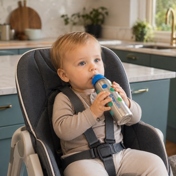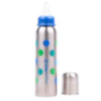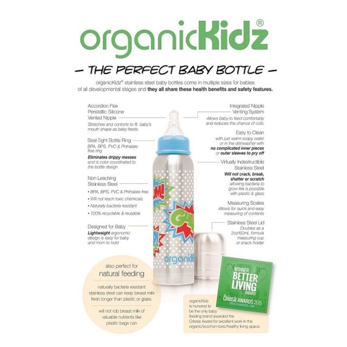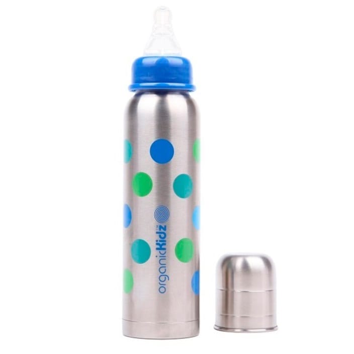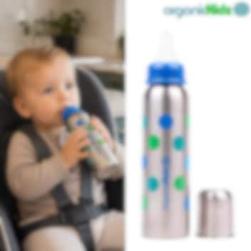 OrganicKidz Dots er en holdbar termoflaske til børn og sutteflaske til babyer, lavet af rustfrit stål med termofunktion – en drikkeflaske med termofunktion og termo i én. Flasken holder drikken varm eller kold i op til 6 timer, hvilket gør den perfekt til både hjemmebrug, på tur, i byen eller i naturen. Den bule- og brudsikre sutteflaske er sikker for børn og et godt alternativ til plast- og aluminiumsflasker. Når barnet vokser, kan flasken bruges som termoflaske med drikketud eller som almindelig termos til varme drikke eller vand. Flasken er fremstillet af rustfrit stål, fri for PVC, bisphenol A og ftalater. Den har en blød silikonesut og et låg, der også fungerer som målebæger, hvilket gør den både praktisk og holdbar. OrganicKidz Dots er et alsidigt og sikkert valg til børn og babyer, som gør måltider og drikkeoplevelser nemmere og sjovere.