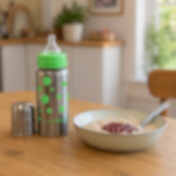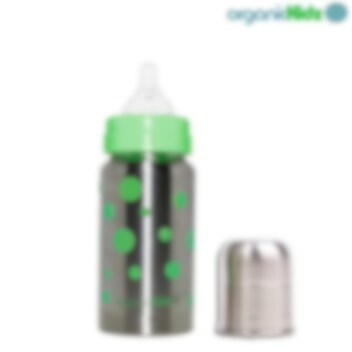 OrganicKidz Green Dots er en holdbar termoflaske til børn og sutteflaske til babyer, lavet af rustfrit stål med termofunktion – en drikkeflaske med termofunktion og termo i én. Flasken holder drikken varm eller kold i op til 6 timer, hvilket gør den perfekt til både hjemmebrug, på tur, i byen eller i naturen. Den bule- og brudsikre sutteflaske er sikker for børn og et godt alternativ til plast- og aluminiumsflasker. Når barnet vokser, kan flasken bruges som termoflaske med drikketud eller som almindelig termos til varme drikke eller vand. Flasken er fremstillet af rustfrit stål, fri for PVC, bisphenol A og ftalater. Den har en blød silikonesut og et låg, der også fungerer som målebæger, hvilket gør den både praktisk og holdbar. OrganicKidz Green Dots er et alsidigt og sikkert valg til børn og babyer, som gør måltider og drikkeoplevelser nemmere og sjovere.