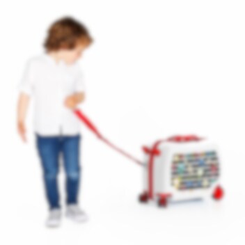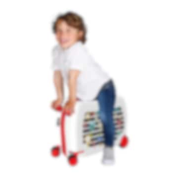 • Børnekuffert med hjul som kan siddes på