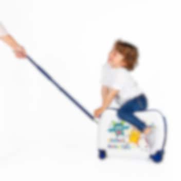 • Børnekuffert med hjul som kan siddes på
