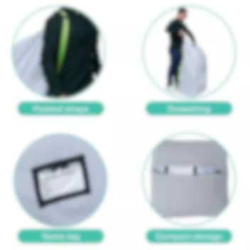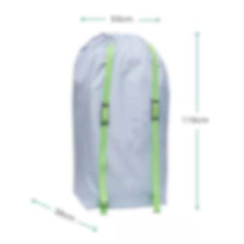 Bramble Baby Stroller Transport Bag Grey er en robust og beskyttende transporttaske til barne- og klapvogne i rummelig størrelse (116 x 53 x 34 cm). Tasken har justerbare stropper, så den nemt kan bæres på ryggen, og den er fremstillet i slidstærkt og vandtæt polyester (600 D Oxford Fabric), hvilket sikrer effektiv beskyttelse mod snavs og ridser – eksempelvis under flyrejser. Transporttasken lukkes med snor, har plads til navneskilt og en lille praktisk opbevaringslomme. Når den ikke er i brug, kan den pakkes kompakt i den medfølgende pakkepose, så den fylder minimalt.