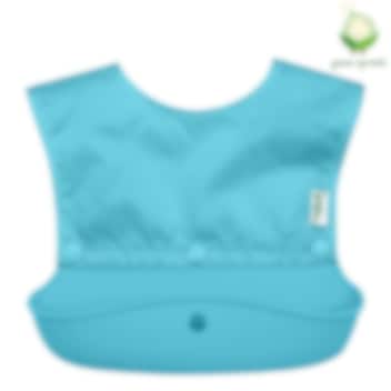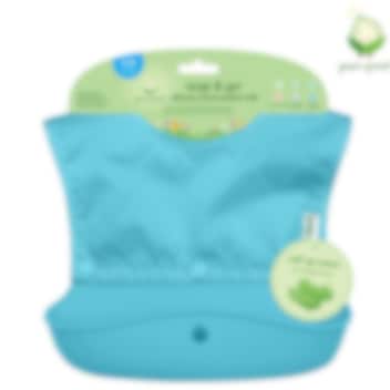 Green Sprouts Snap & Go Aqua er en smart og praktisk hagesmæk. Efter fodring rulles hagesmækken nemt sammen og spændes fast, så indholdet ikke vælter ud. Det betyder, at hagesmækken ikke behøver at blive vasket med det samme, men kan tages med hjem og rengøres senere. Hagesmækken har en opsamlingslomme i fødevaregodkendt silikone, og overdelen, som er aftagelig, er lavet af vandtæt materiale. Overdelen kan maskinvaskes, mens opsamlingslommen vaskes separat. Snap & Go-modellen har buede sider, der følger barnets bevægelser, hvilket gør hagesmækken komfortabel og praktisk at bruge. Kort sagt: en hagesmæk, der er lige så god på tur som hjemme, og som nemt kan tages med i håndbagagen, pusletasken eller pungen.