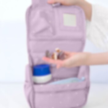 Tutete Stars Lilac er en stilfuld og praktisk toilettaske til børn, designet til at holde styr på alle toiletartikler på rejser og overnatninger hos familie og venner. Tasken har et rummeligt hovedrum med mange forskellige lommer og rum samt et spejl, så barnet nemt kan organisere sine ting. For nem adgang kan toilettasken hænges på en ophængningskrog, og yderligere opbevaringsrum findes på taskens sider og bagside. Med et praktisk håndtag øverst er den nem at bære og tage med på farten. Lavet af vandafvisende materiale sikrer Tutete Stars Lilac, at indholdet holdes tørt og organiseret.
